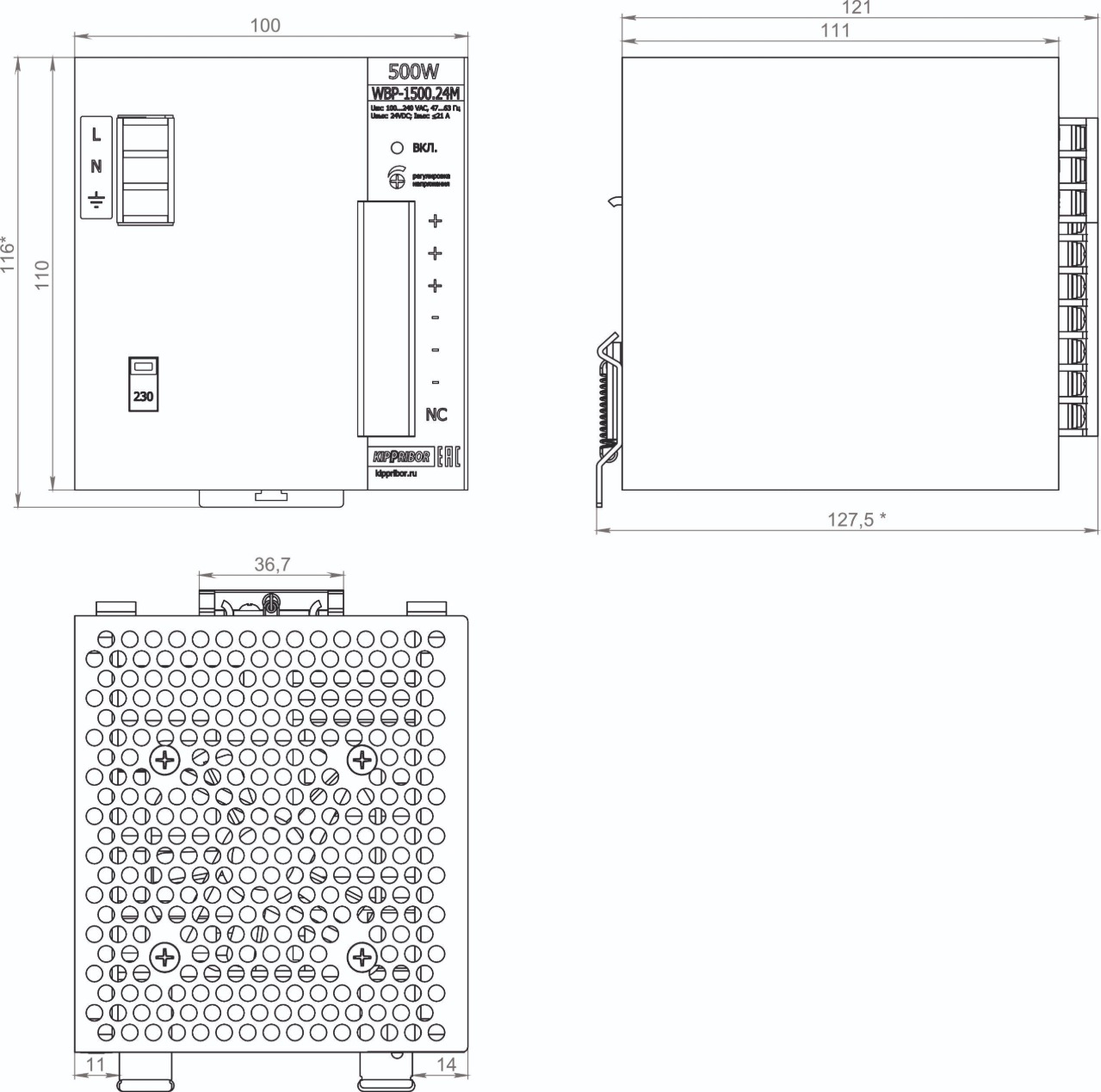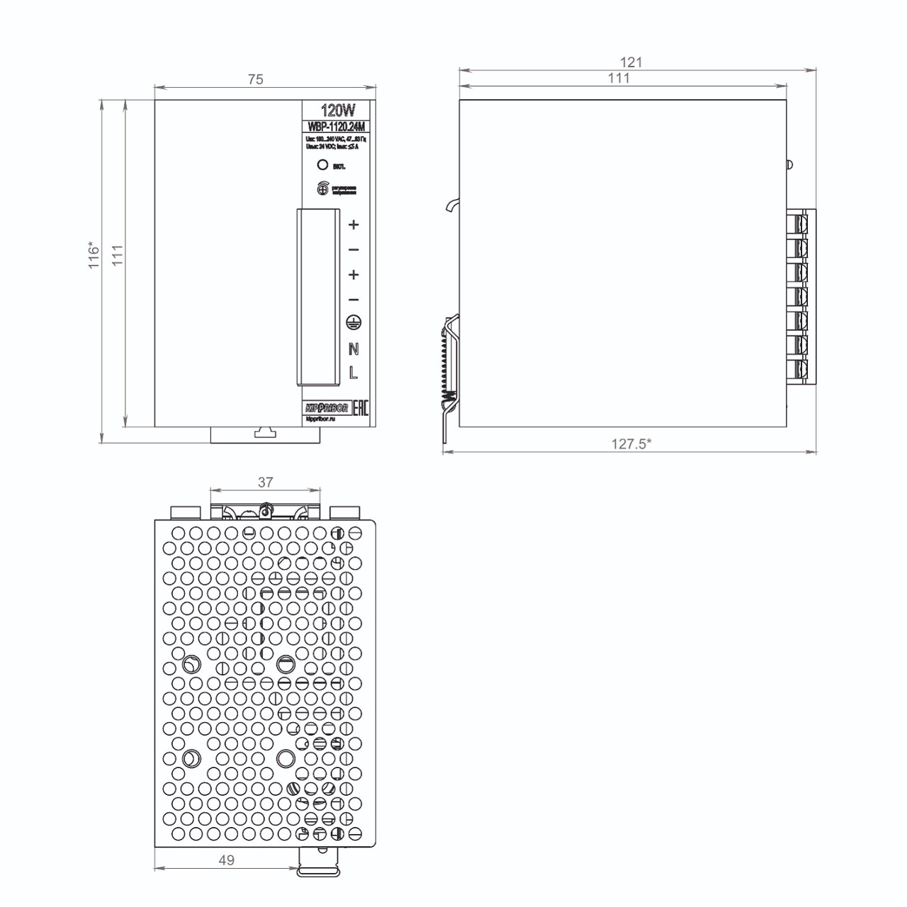 Описание клемм, элементов управления и индикации промышленных блоков питания KIPPRIBOR серии WBP: