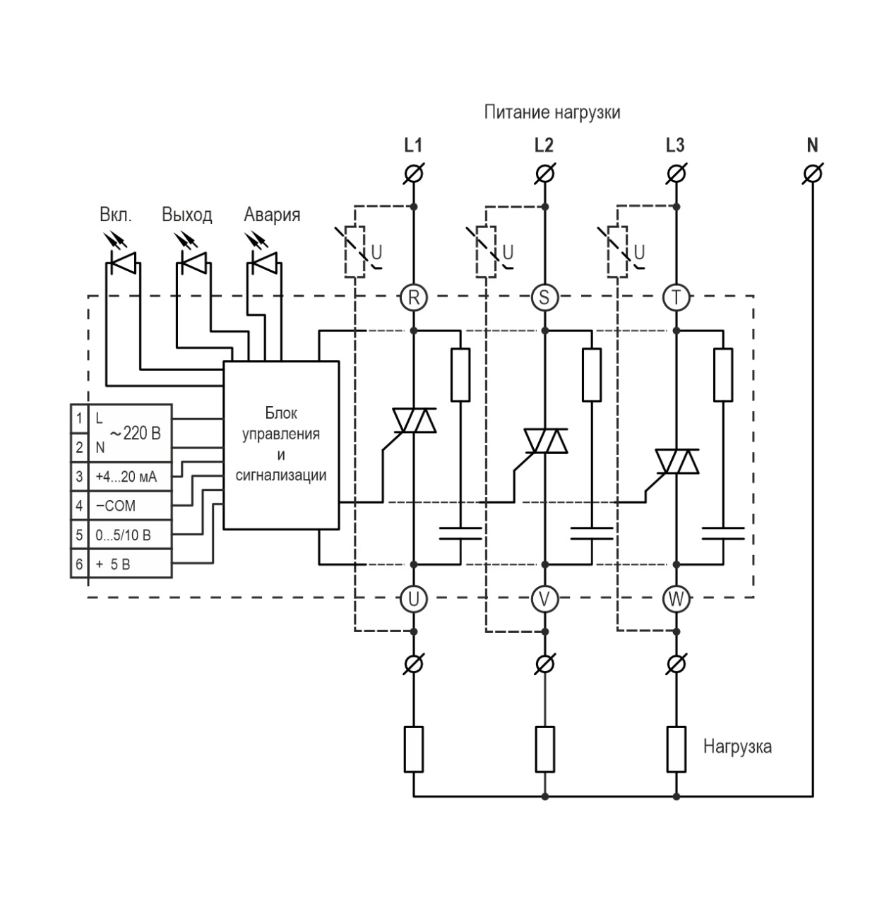 - Номинальное напряжение питания нагрузки: 220/380 VAC.